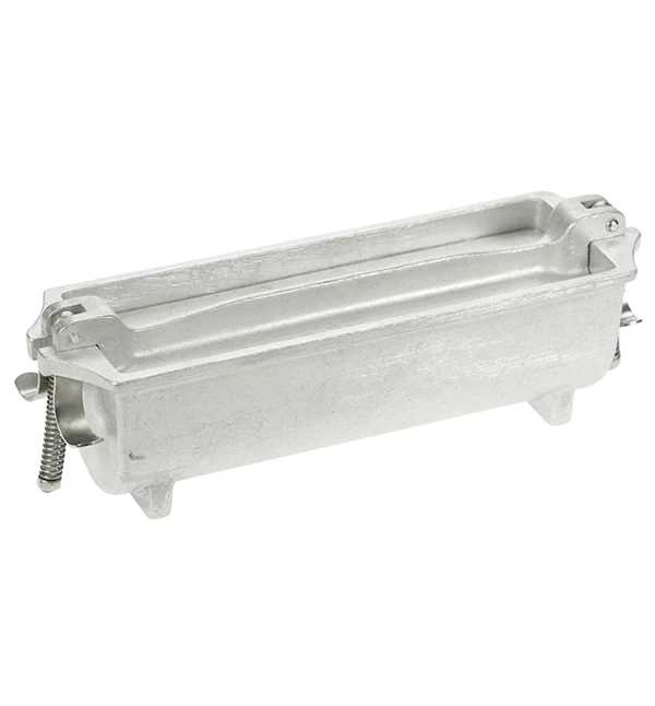 De Adelmann patévorm 2R van gietaluminium heeft een lengte van 25 cm, een breedte en hoogte van 10 cm en een capaciteit van 2,25 kg. Gebruik de patévorm voor de bereiding van halfronde patés en terrine gerechten, zoals aspic.