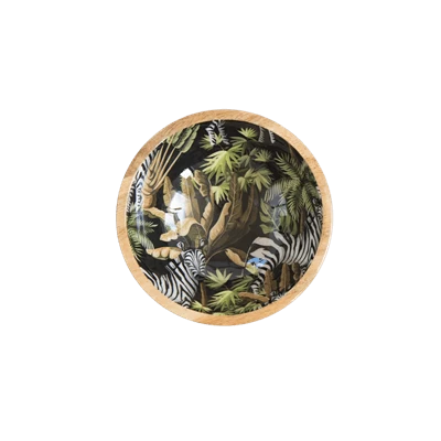 Op zoek naar een stijlvolle schaal om (zomerse) salades of andere gerechten te serveren? Dit exemplaar van By Room is er één voor op uw wensenlijst! Het item is vervaardigd uit mangohout en heeft een rond design met een diameter van 18 cm. De binnenkant is voorzien van een sticker met zebra in jungle print voor een speels effect. Combineer de schaal met het bijpassende slacouvert voor een elegant geheel.