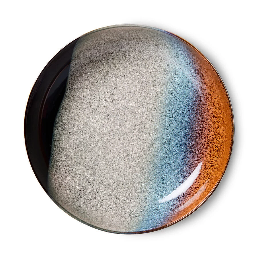 De HK Living 70’s Flower Power saladeschaal is gemaakt van blauw, oranje, grijs en zwart geglazuurd aardewerk. De saladeschaal heeft een diameter van 26,5 cm en is 6 cm hoog, de inhoud bedraagt 1,8 liter. Het aardewerk is magnetron- en vaatwasmachinebestendig. Gebruik voor het serveren van salade of andere gerechten.