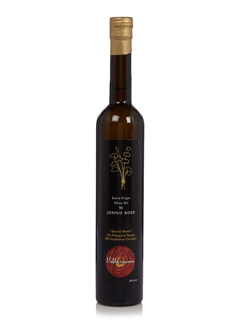 Fles van 500 ml Jonnie Boer Valderama extra vergine olie van arbequina olijven. Deze olijfolie heeft een zachte fruitige smaak met tonen van groene appel, mango, banaan en limoen. Hierdoor leent de olie zicht zeer goed voor gebruik in salades, dressings en risotto’s.