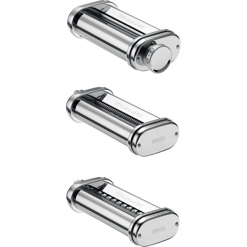 De driedelige KitchenAid pastaroller en –snijderset bestaat uit een pastaroller met instelbare dikte voor het maken van deegvellen, een snijroller voor fettuccine en een snijroller voor het maken van spaghetti. Elk van de drie accessoires uit de set is volledig gemaakt uit roestvrij staal, inclusief de deeg- en snijrollen zelf. Bij de pastaroller en –snijderset wordt een schoonmaak borsteltje meegeleverd. De KitchenAid pastaset bestaat uit de volgende delen: