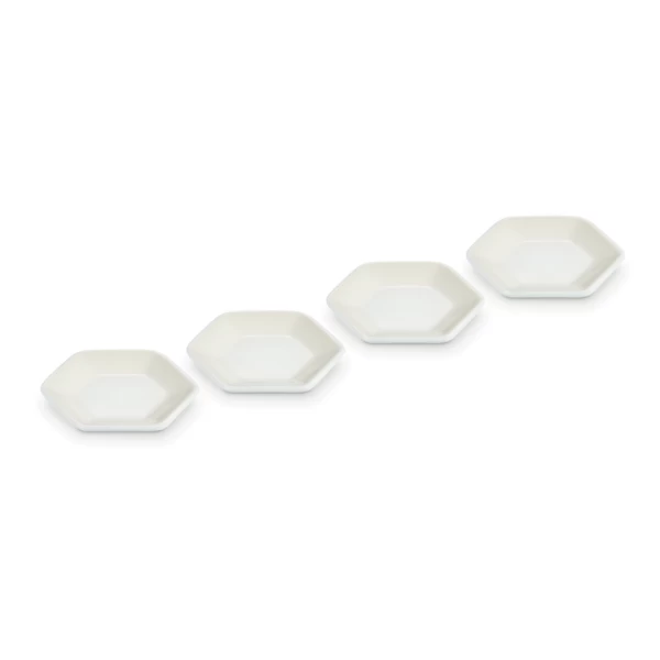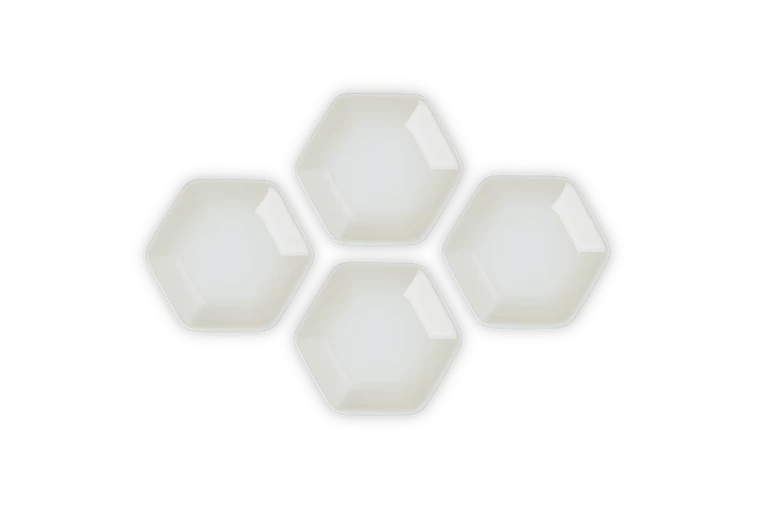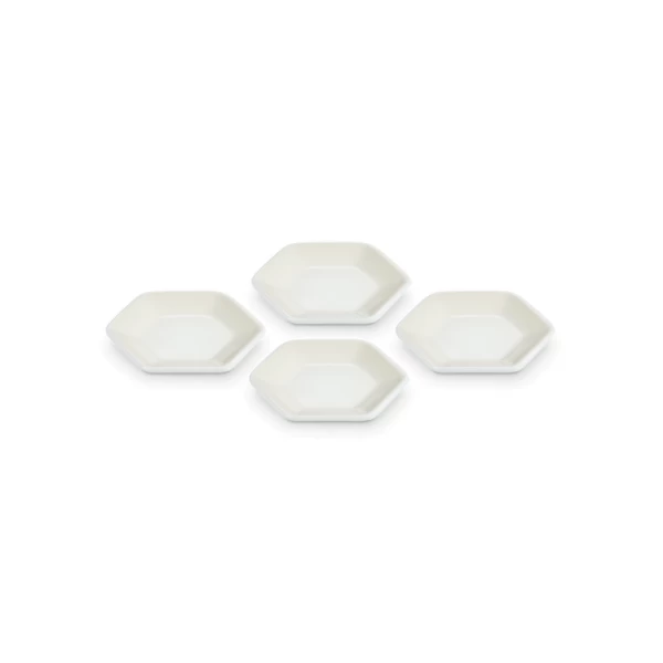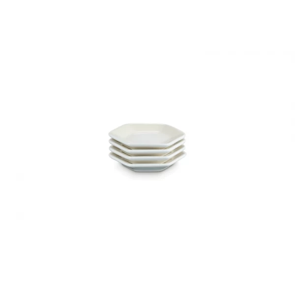 De vier Le Creuset serveerschaaltjes zijn gemaakt van geglazuurd aardewerk, uitgevoerd in crèmekleur. De schaaltjes zijn 8,5 cm breed, 9,5 cm lang en 1,5 cm hoog. Gebruik om (dip)sauzen te serveren.